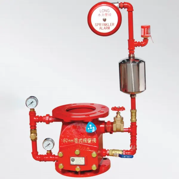 The ZSFZ wet alarm valve, together with other components such as pressure switches, water flow indicators, and sprinklers, forms the ZS wet-type automatic sprinkler fire extinguishing system, a widely used fixed fire suppression system. The system’s piping network is filled with pressurized water and remains in standby mode for long-term readiness. It is suitable for use in environments with temperatures ranging from 4°C to 70°C and must be installed vertically. When a fire occurs in the protected area, the ambient temperature rises, causing the temperature-sensitive element (glass bulb) of the sprinkler to break. The sprinkler automatically discharges water directly onto the fire and triggers an alarm, achieving the purposes of alerting, extinguishing, and controlling the fire. The device mainly consists of the alarm valve, hydraulic alarm bell, retard chamber, pressure switch, pressure gauge, drain valve, and test ball valve.